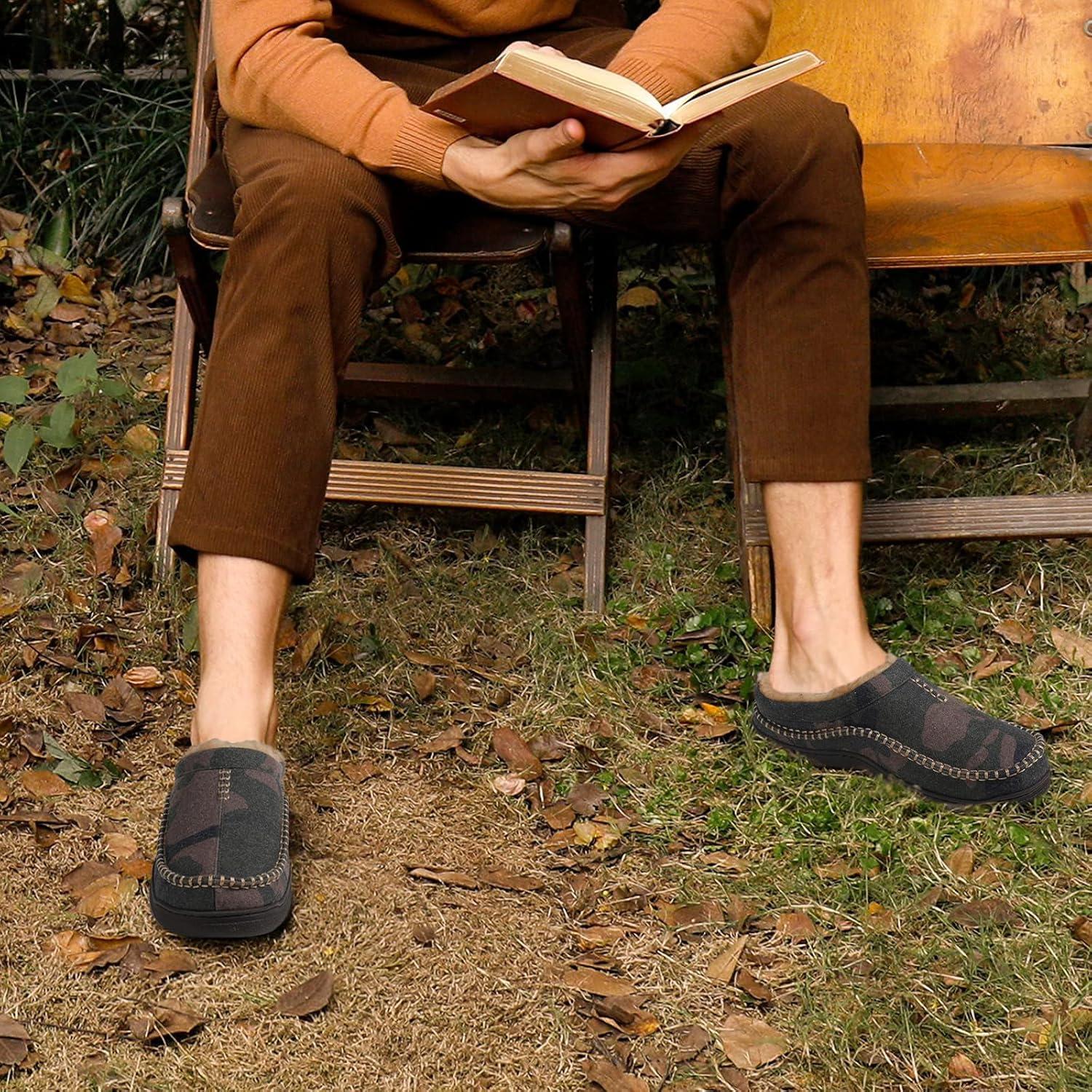 Zigzagger Double the Style Set of 2 Pairs Size 11-12,Men’s Slip On Moccasin Slippers, Indoor/Outdoor Warm Fuzzy Comfy House Shoes, Fluffy Wide Loafer Slippers,Coffee&Camouflage Camel